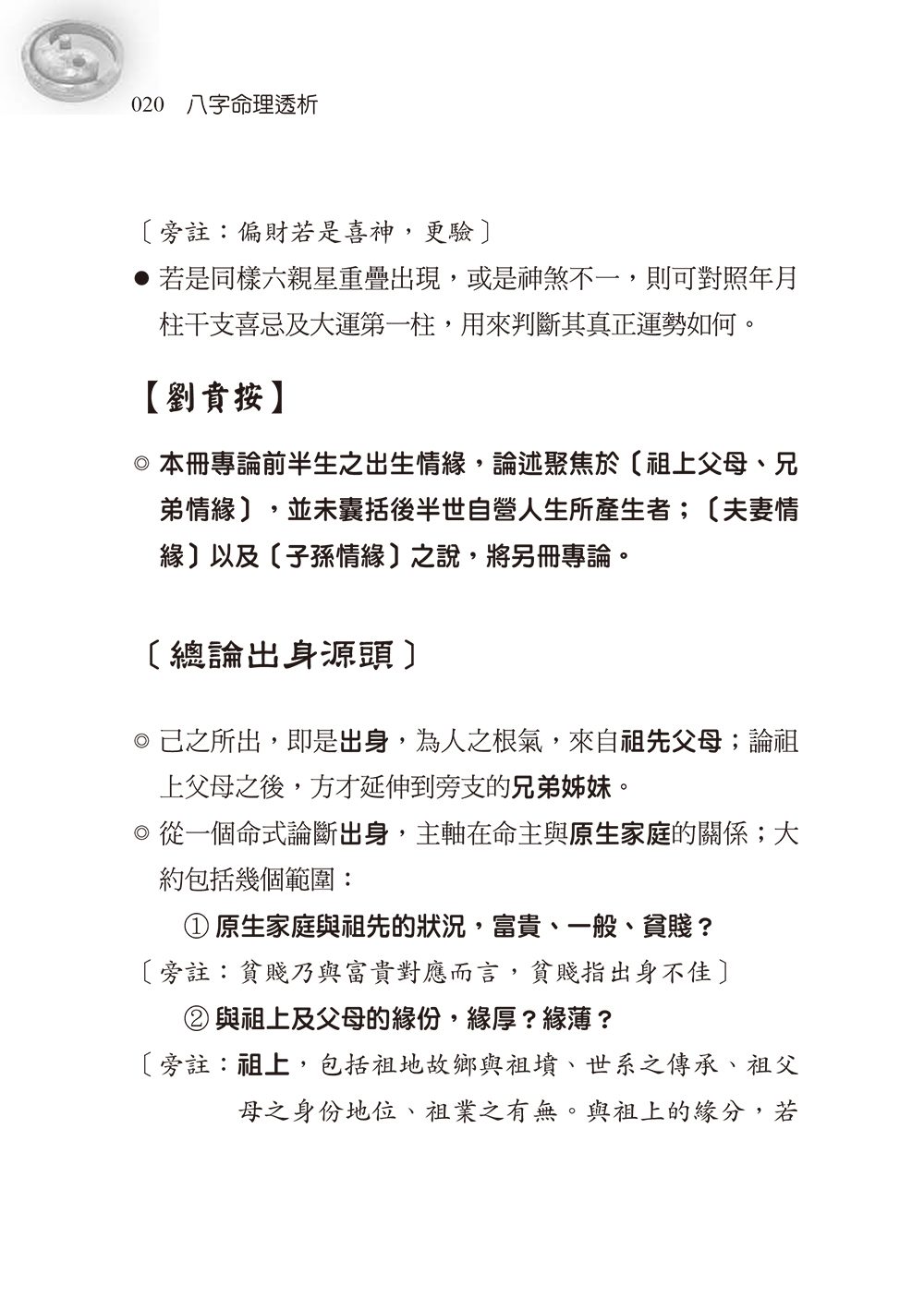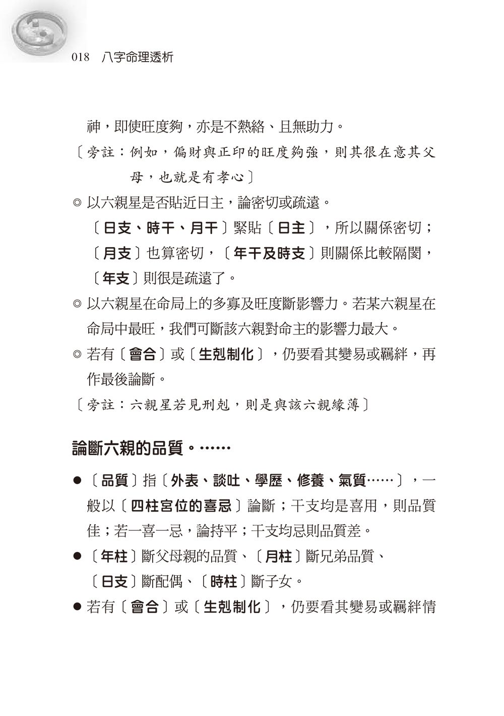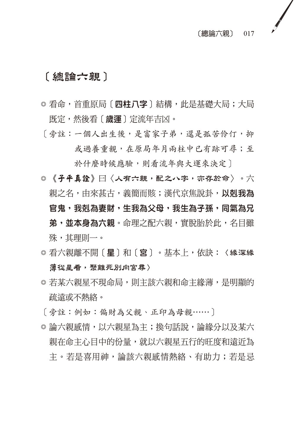 ◎ 《子平真詮》曰〈人有六親,配之八字,亦存於命〉。六親之名,由來甚古,義簡而賅;漢代京焦說卦,以剋我為官鬼,我剋為妻財,生我為父母,我生為子孫,同氣為兄弟,並本身為六親。命理之配六親,實脫胎於此,名目雖殊,其理則一。