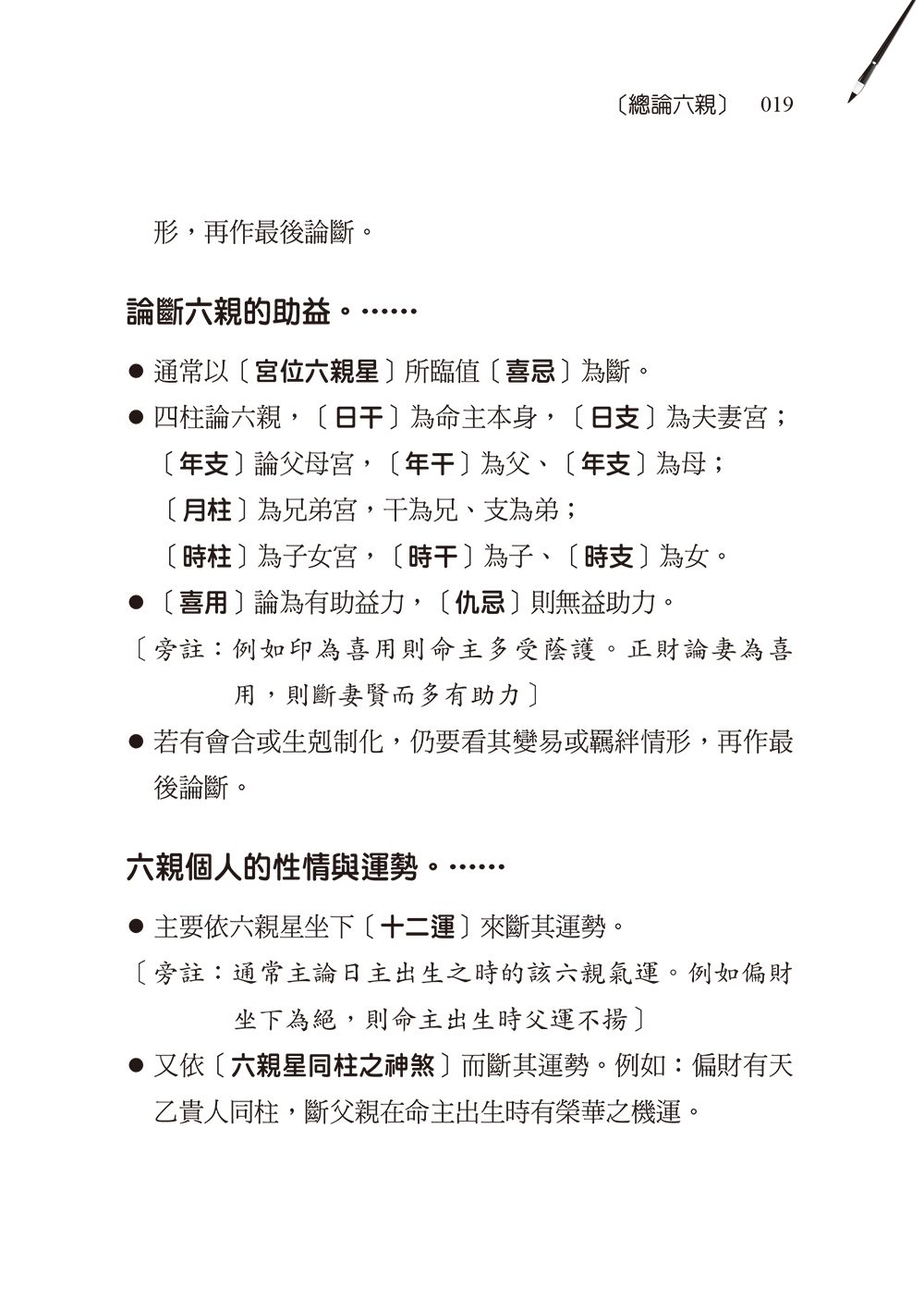 ◎ 論六親感情,以六親星為主;換句話說,論緣分以及某六親在命主心目中的份量,就以六親星五行的旺度和遠近為主。若是喜用神,論該六親感情熱絡、有助力;若是忌神,即使旺度夠,亦是不熱絡、且無助力。
