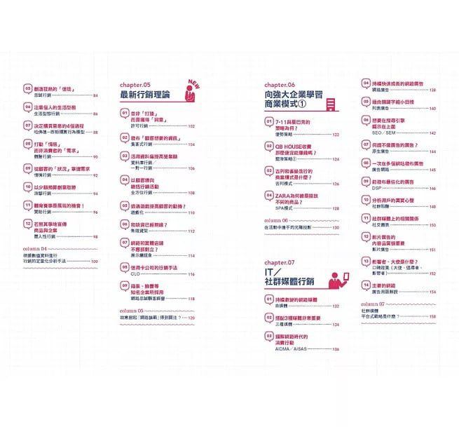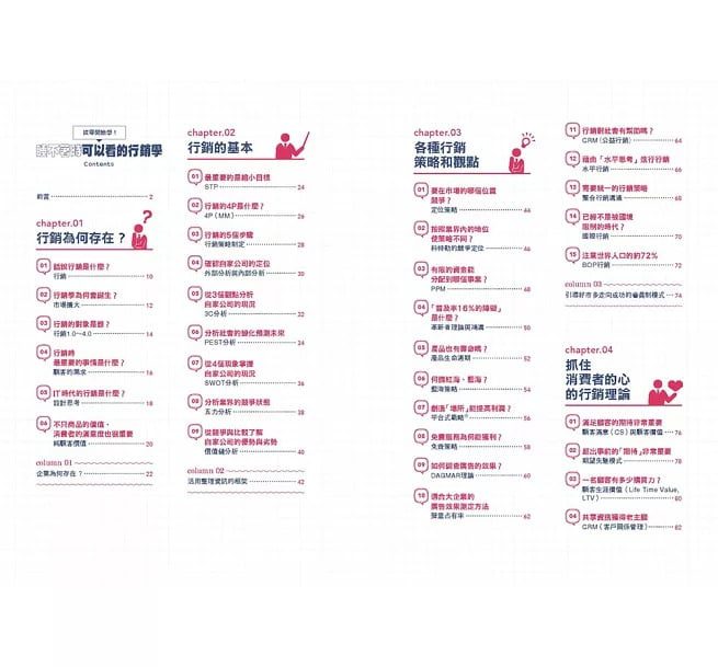 具體而言,行銷是什麼?從這個疑問開始,從最基本的行銷組合STP、4P(MM)框架,到SWOT分析、3C分析、科特勒的競爭定位、DAGMAR理論、全方位行銷、哈佛德-西斯購買行為模型、無限貨架,此外還有最新的數位行銷三種媒體、AIDMA/AISAS、列表廣告、SEO/SEM、廣告網路、DSP、快閃行銷、SERVQUAL模型、直接行銷,可以一口氣學到廣泛的最新行銷精髓。