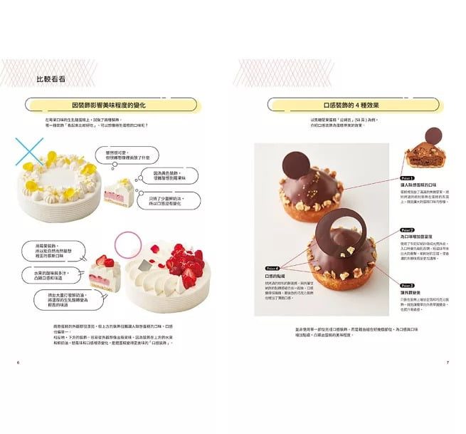 例如,在草莓口味的慕斯上裝飾新鮮的莓果,除了讓人聯想口味也增加水分感;在用了大量濃厚奶油的蛋糕上,裝飾香濃的堅果突顯口感;在苦澀的甘納許蛋糕上,擠出鬆軟滑順的奶油,可以調和味道和口感的平衡。